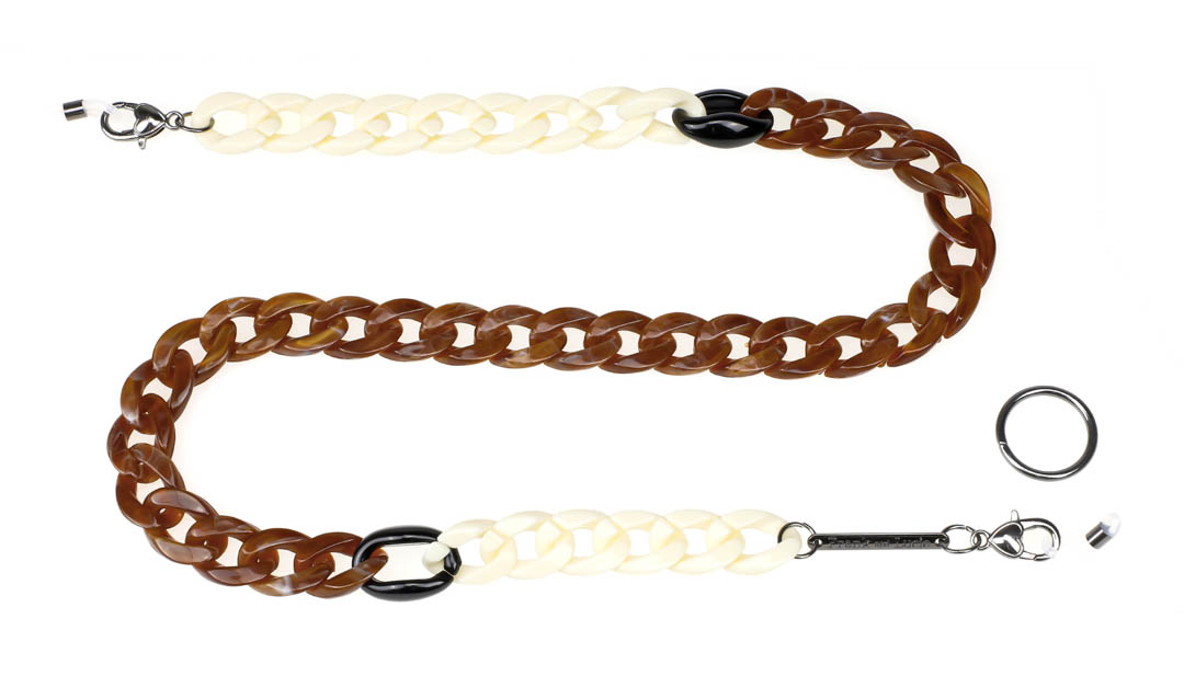 Luxe schakelketting voor uw leesbril of sunreader. De kleuren passen erg goed bij de Frank and Lucie collectie, zoals dit exemplaar bij havanna en zwart maar natuurlijk ook bij vele andere brillen. Deze midbruin met creme uitvoering draagt heerlijk licht. De schakels zijn mooi afgewerkt en vallen prachtig om iedere hals. Met de bijgeleverde ring kunt u van de brilketting ook een halsketting maken waar u uw bril in hangt. Een sieraad met functie!
