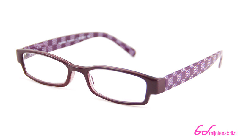 Stevige leesbril met goede flexveren, waardoor de bril makkelijk op en af gaat en ook goed in model blijft. De voorzijde is in een mooie tint paars uitgevoerd, de poten hebben een decoratief ruitpatroon. Een handige leesbril met een goede uitstraling.