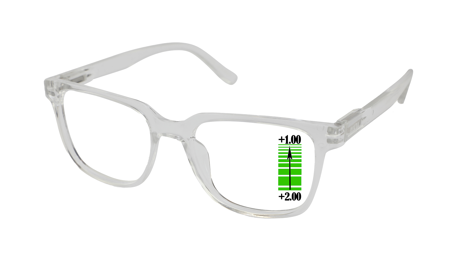 De CUBO multifocale leesbril combineert verschillende plus (+)sterktes in één glas waarbij de sterkte progressief oploopt naar de gewenste leessterkte. De bovensterkte is doorgaans de helft van de leessterkte. Zo heeft een +2.00 CUBO