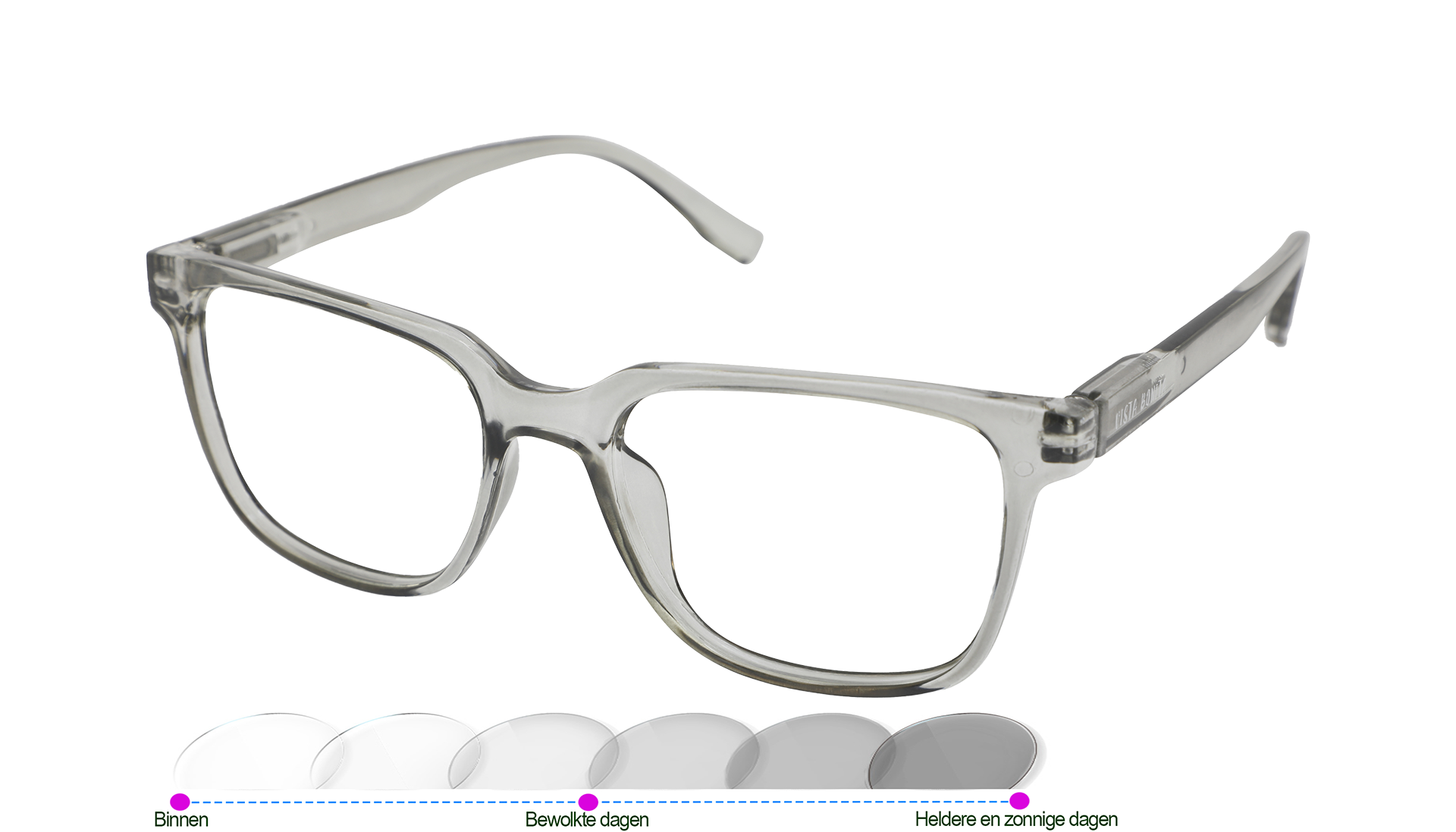 De Vista Bonita Cubo leesbril met photochromische glazen, die automatisch van kleur veranderen bij blootstelling aan UV-licht. Deze glazen passen zich aan de lichtomstandigheden aan: binnen blijven ze helder, en buiten kleuren ze donkerder om je ogen te beschermen tegen fel zonlicht. Zo hoef je niet steeds van bril te wisselen wanneer je van binnen naar buiten gaat.