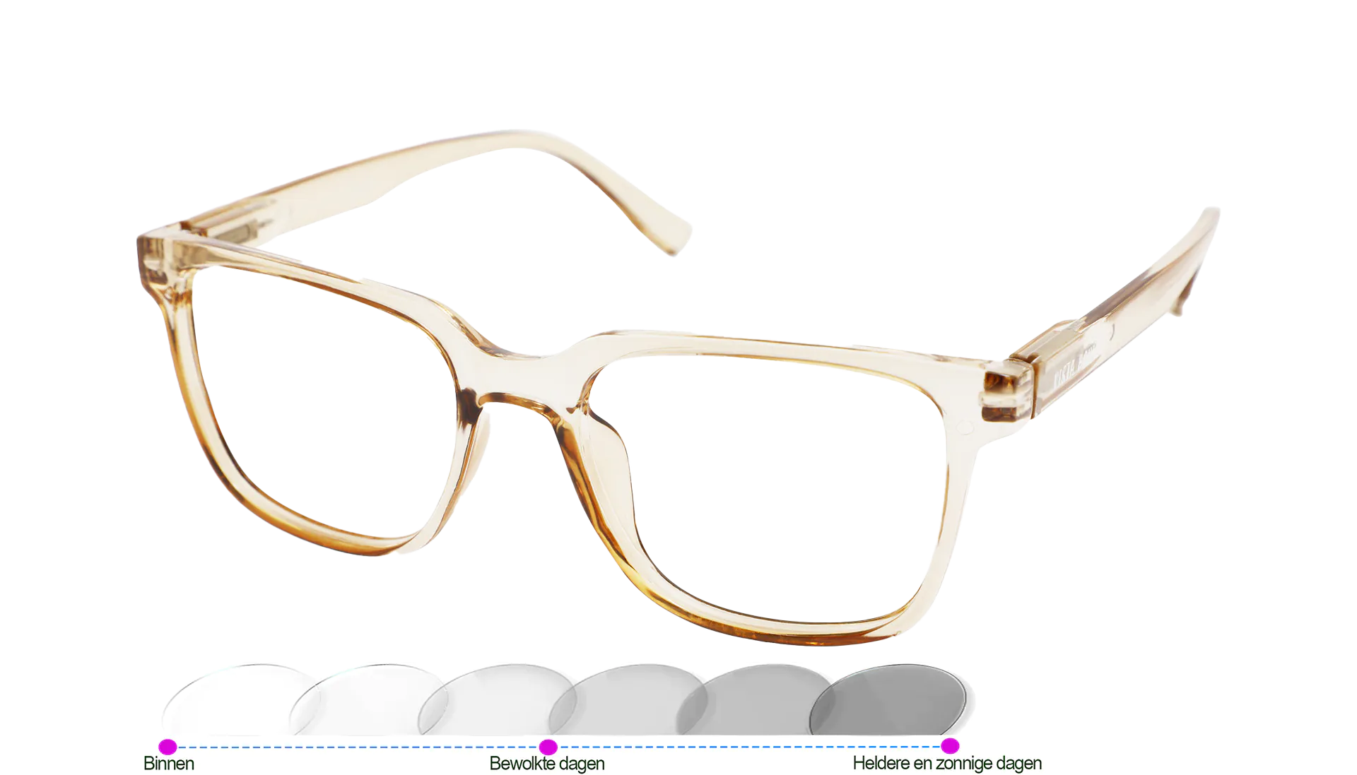 De Vista Bonita Cubo leesbril met photochromische glazen, die automatisch van kleur veranderen bij blootstelling aan UV-licht. Deze glazen passen zich aan de lichtomstandigheden aan: binnen blijven ze helder, en buiten kleuren ze donkerder om je ogen te beschermen tegen fel zonlicht. Zo hoef je niet steeds van bril te wisselen wanneer je van binnen naar buiten gaat.