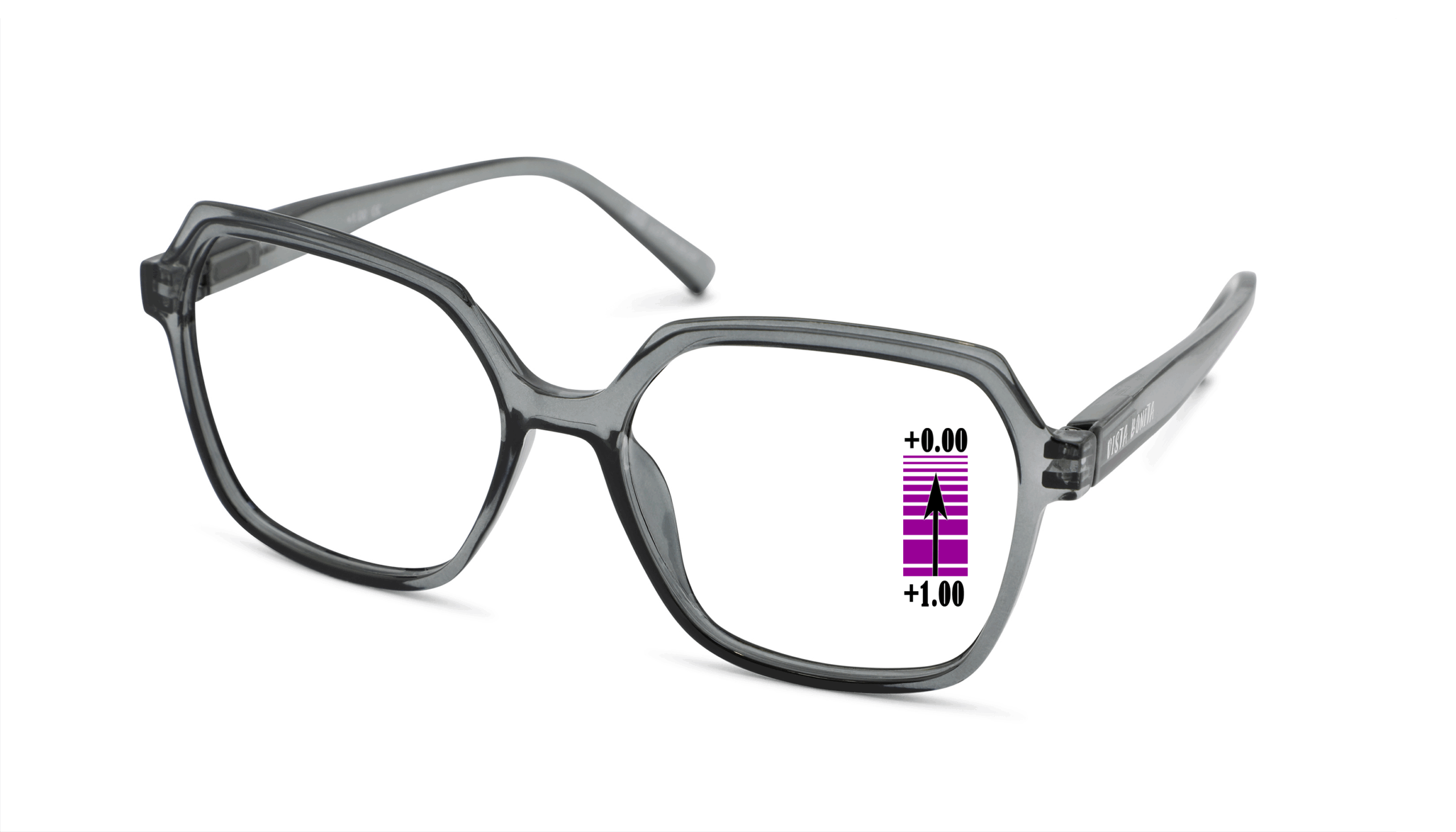 Het kunststof montuur is stevig, van hoogwaardige kwaliteit en zit comfortabel op de neus. De afwerking met flexveren zorgt voor extra draagcomfort en voorkomt dat de veren snel breken. Deze progressieve leesbril heeft bovenaan glazen zonder sterkte, zodat je veraf scherp ziet, en een onderste leesgedeelte met de gekozen sterkte voor dichtbij.