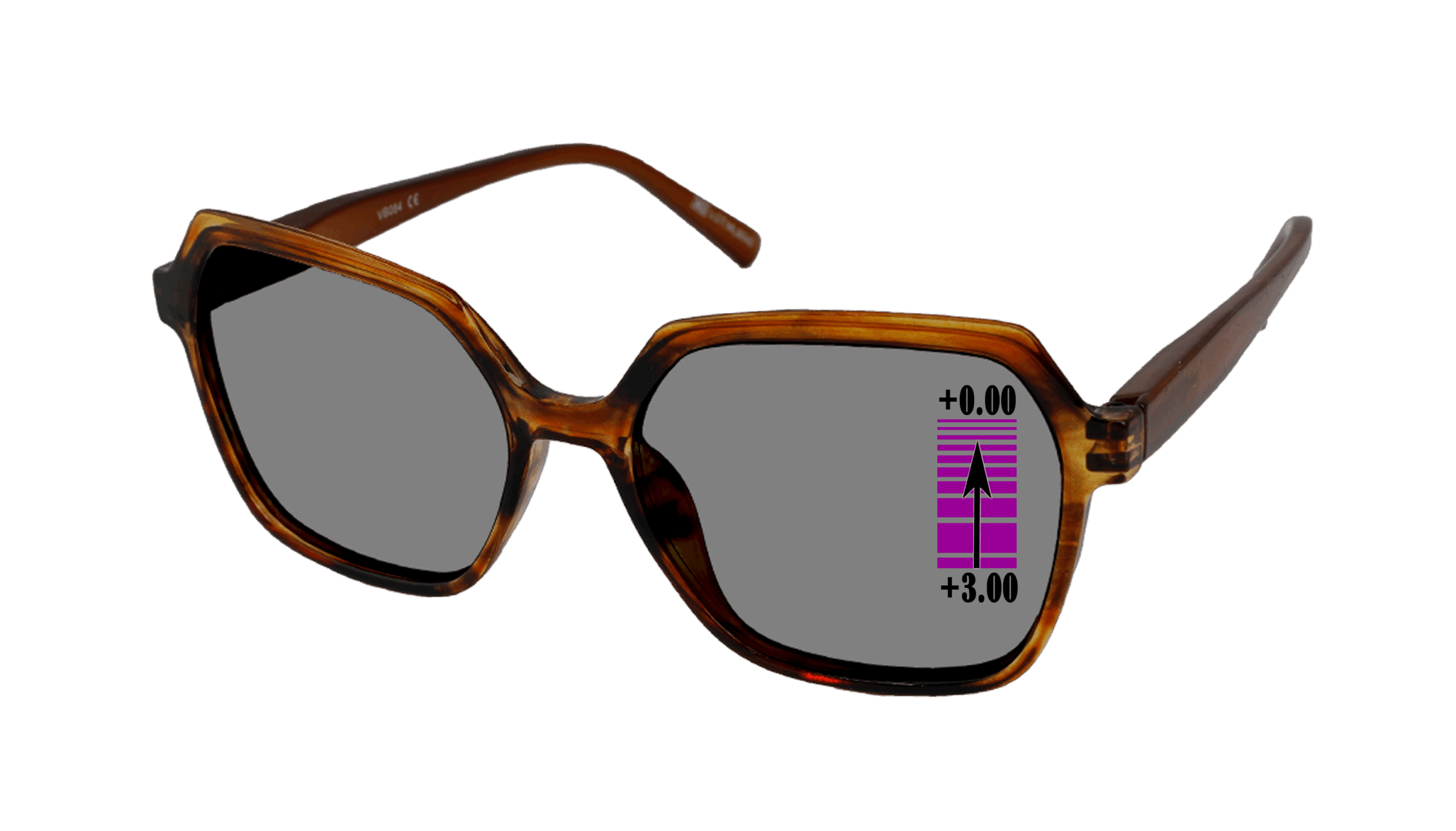 Het kunststof montuur is stevig, van hoogwaardige kwaliteit en zit comfortabel op de neus. De afwerking met flexveren zorgt voor extra draagcomfort en voorkomt dat de veren snel breken. Deze progressieve zonneleesbril heeft bovenaan glazen zonder sterkte, zodat je veraf scherp ziet, en een onderste leesgedeelte met de gekozen sterkte voor dichtbij.