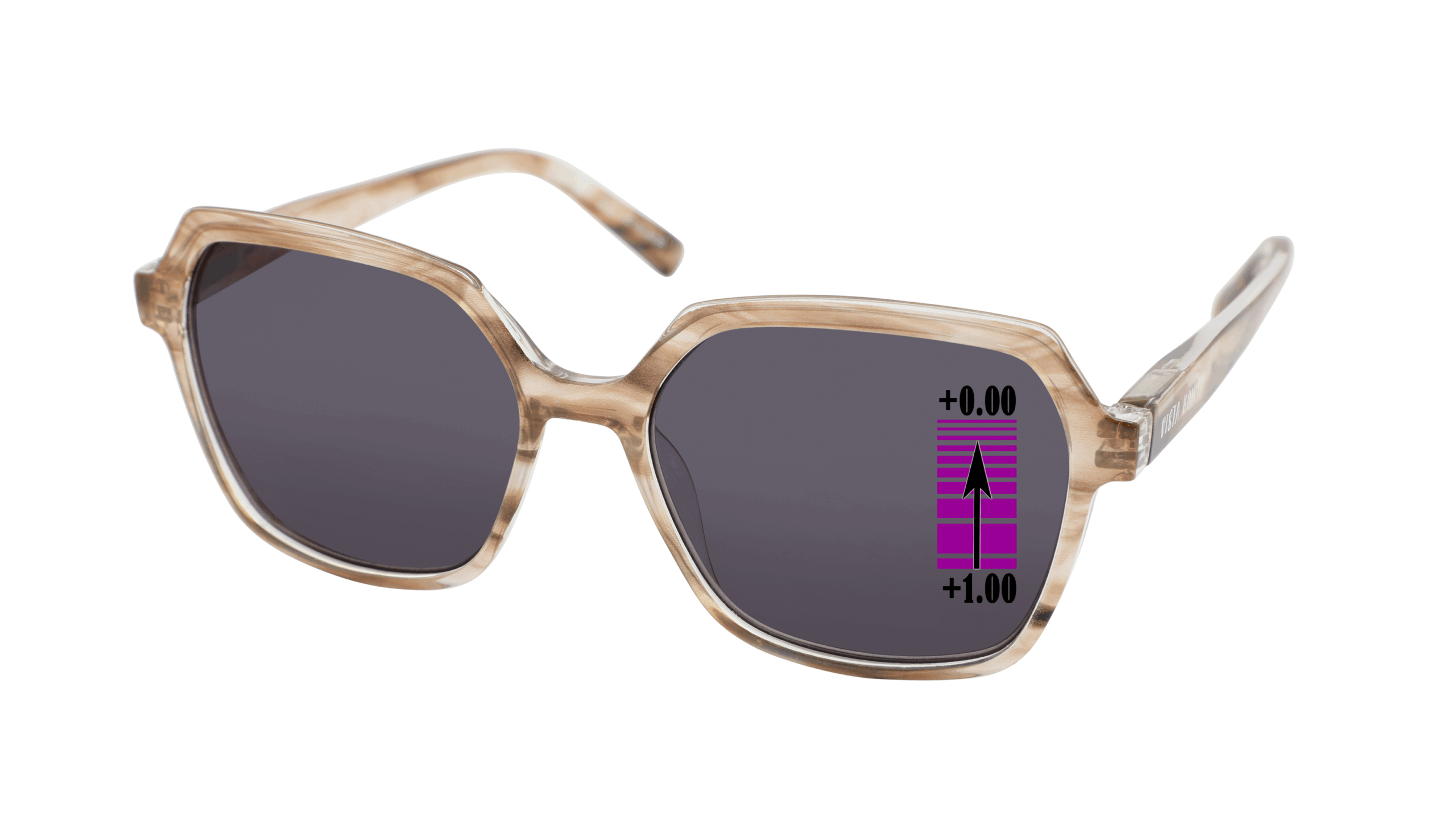 Het kunststof montuur is stevig, van hoogwaardige kwaliteit en zit comfortabel op de neus. De afwerking met flexveren zorgt voor extra draagcomfort en voorkomt dat de veren snel breken. Deze progressieve zonneleesbril heeft bovenaan glazen zonder sterkte, zodat je veraf scherp ziet, en een onderste leesgedeelte met de gekozen sterkte voor dichtbij.