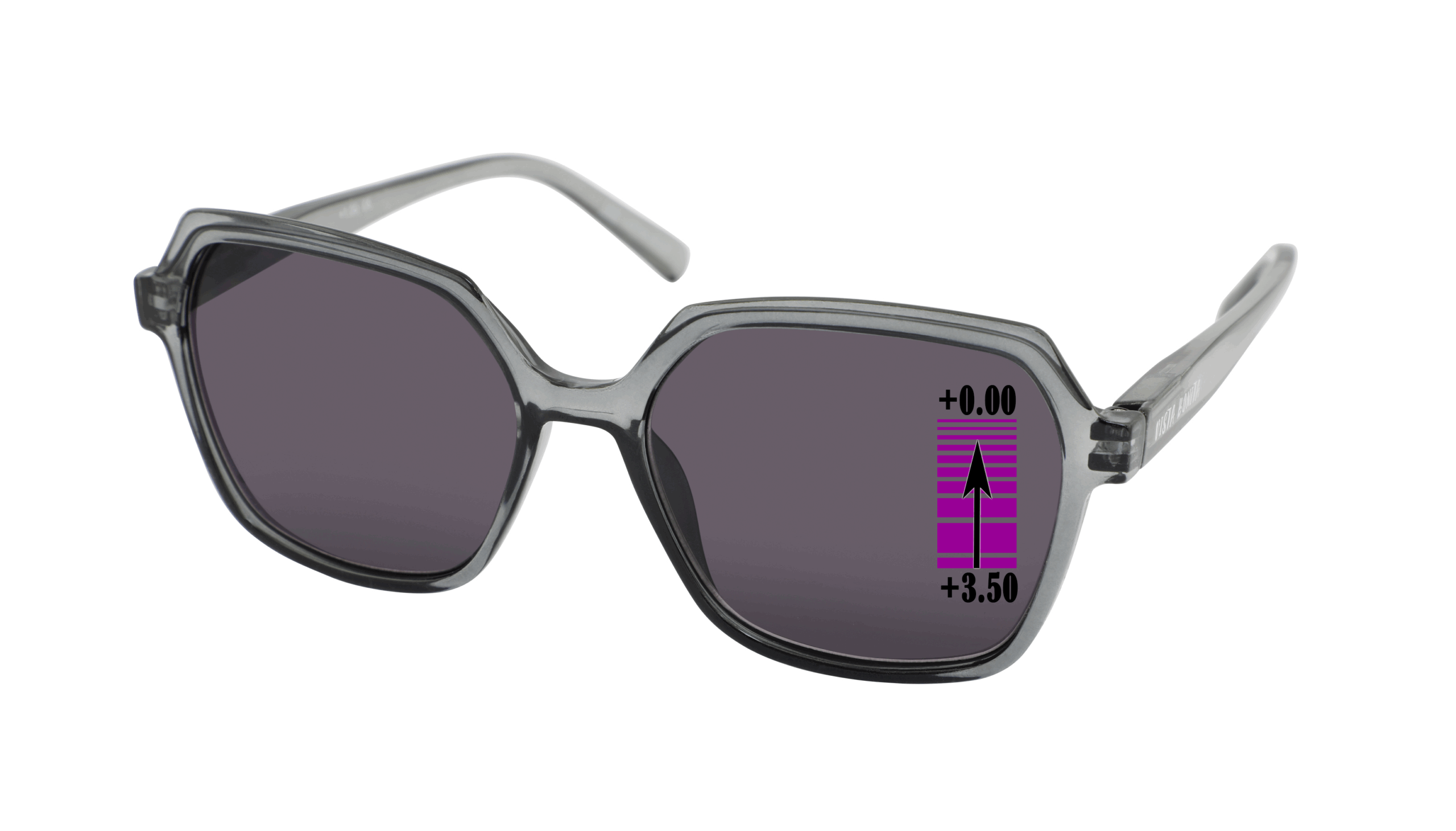 Het kunststof montuur is stevig, van hoogwaardige kwaliteit en zit comfortabel op de neus. De afwerking met flexveren zorgt voor extra draagcomfort en voorkomt dat de veren snel breken. Deze progressieve zonneleesbril heeft bovenaan glazen zonder sterkte, zodat je veraf scherp ziet, en een onderste leesgedeelte met de gekozen sterkte voor dichtbij.
